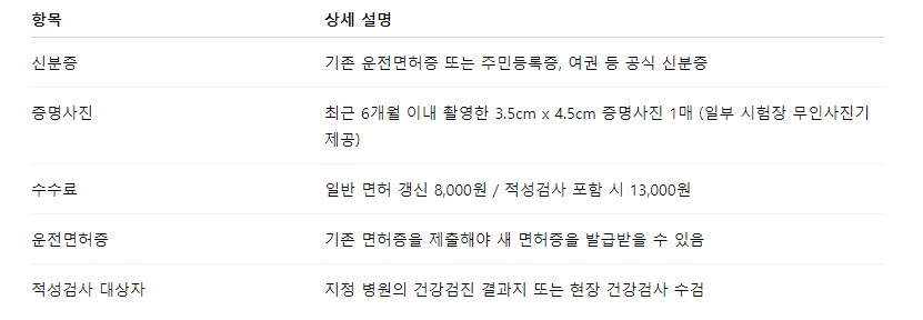 적성검사 시에는 시력·청력 검사 등 건강검진이 포함되며, 수수료는 일반 갱신보다 높습니다.