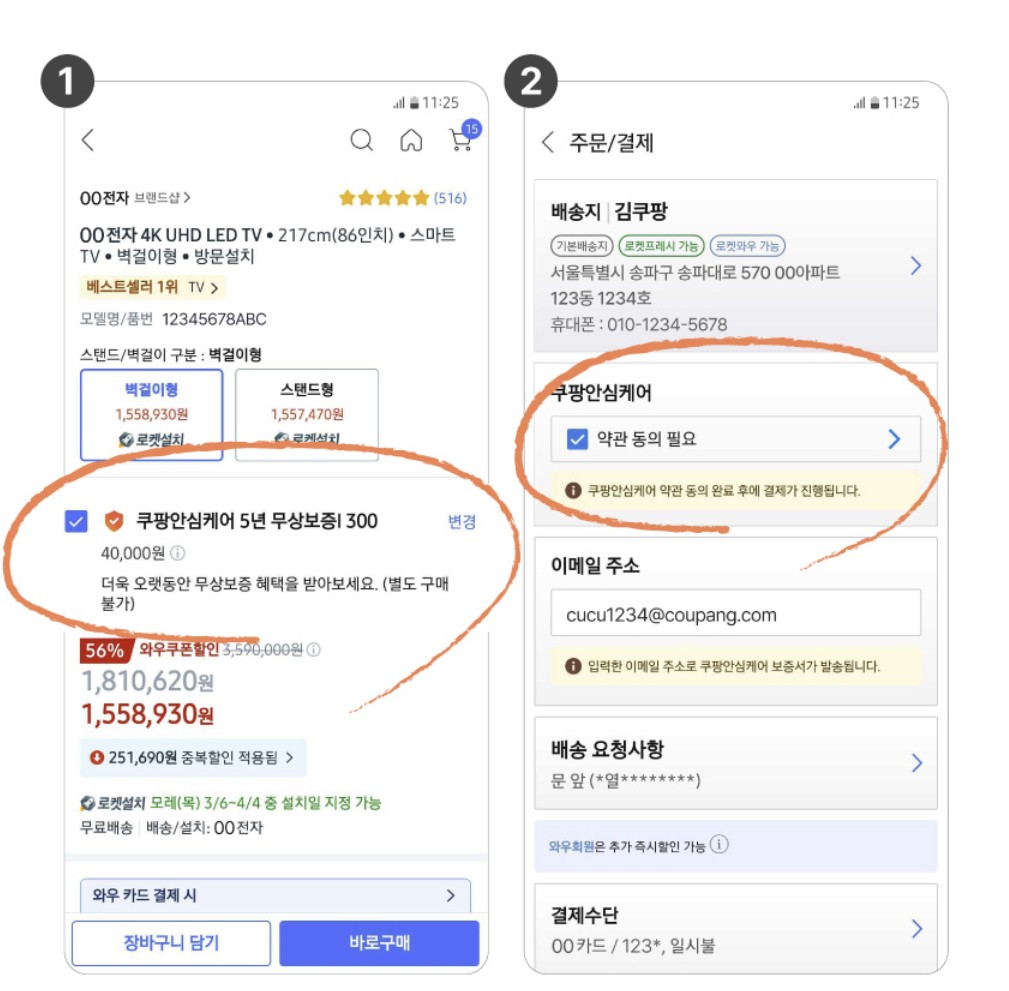 이제 쿠팡에서 전자기기나 고가 제품 구매하실 땐, ‘안심케어 추가하기’ 버튼, 절대 지나치지 마세요! 😉